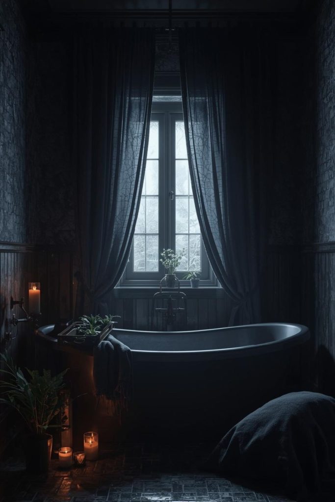 For a dramatic twist, witchy-inspired bathroom window curtains with dark fabrics add mystery and personality. Deep hues like navy, charcoal, or black paired with sheer overlays create a layered, moody effect. These curtains filter light softly, producing a dreamy, cozy ambiance, ideal for evening baths. Heavy panels can be combined with lightweight sheers to allow light during the day while maintaining privacy. Accents like tassels, subtle embroidery, or metallic curtain rods enhance the mystical aesthetic. This style is especially effective in bathrooms with vintage fixtures or dark stone tiles, turning the space into a conversation-worthy retreat. It proves that bathroom window curtains can be both functional and strikingly unique.