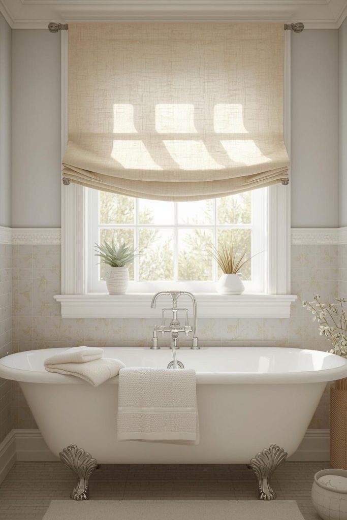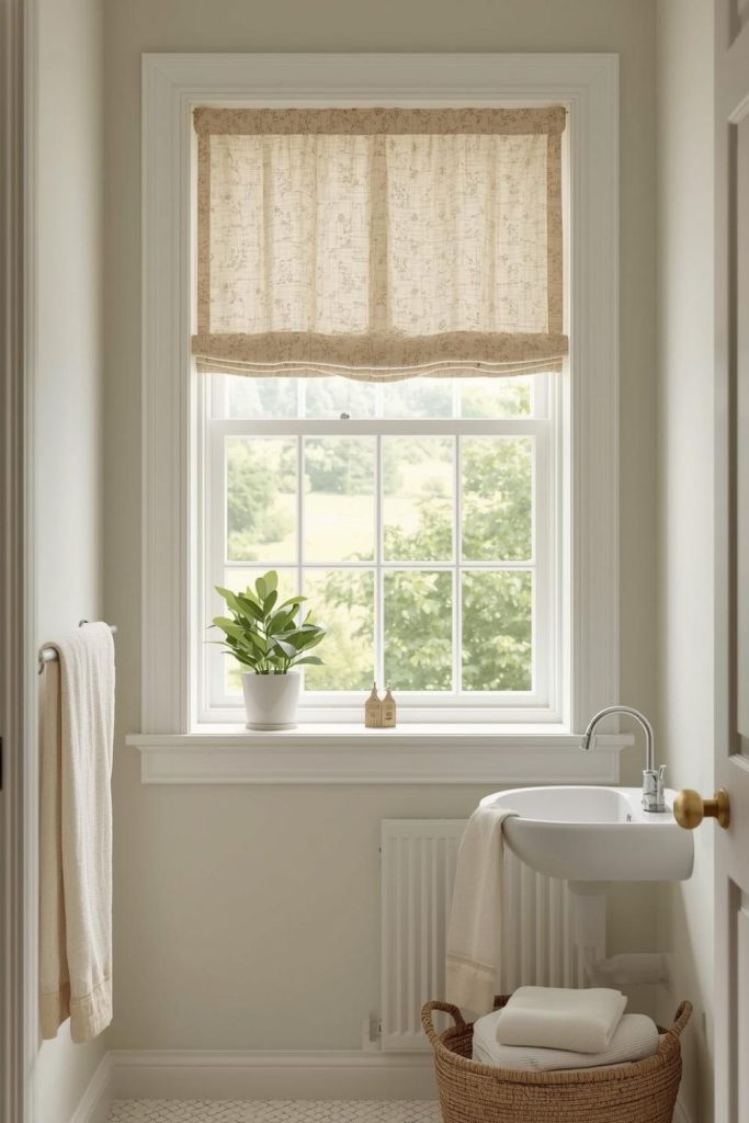Striped Roman shades combined with curtain panels add personality to guest bathrooms. The stripes create vertical interest, visually elongating windows, while panels soften the overall look. Light-filtering fabrics provide privacy while maintaining natural brightness. Tension rods or mounted curtain rods work well depending on window size. Choosing complementary colors ensures the design feels cohesive with the rest of the décor. This approach balances practicality with playful elegance, allowing homeowners to create a welcoming, stylish space that guests will enjoy. It’s a functional yet visually captivating solution.
