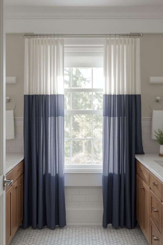 Navy and white bathroom window curtains add a modern farmhouse flair while allowing flexible light control. White sheers provide brightness, while navy panels frame the window for depth and contrast. This combination complements wooden vanities, stone sinks, or shiplap walls, creating a clean yet inviting aesthetic. Curtains can be paired with roller or Roman shades for adjustable privacy. Tension rods make installation easy, particularly in small spaces, while floor-length panels create elegance in larger bathrooms. The navy-and-white pairing is timeless, adding visual interest without feeling overpowering. It’s a practical, stylish solution that balances modern lines with farmhouse charm.