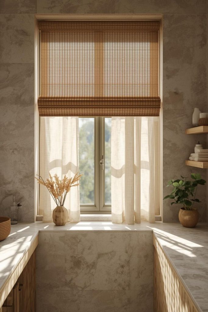 Bamboo shades paired with bathroom curtain coverings create a natural, eco-conscious aesthetic. Bamboo is durable, moisture-resistant, and visually appealing, complementing neutral fabrics or soft cotton panels. The combination allows homeowners to filter sunlight while maintaining privacy, especially near tubs or street-facing windows. Panels can be tied back or layered with sheers for versatility. Bamboo’s texture adds depth and organic warmth, making even a small bathroom feel inviting. Easy to clean and resistant to humidity, this solution offers both style and practicality. It’s perfect for homeowners looking to blend functionality with natural materials and a relaxed, earthy vibe.
