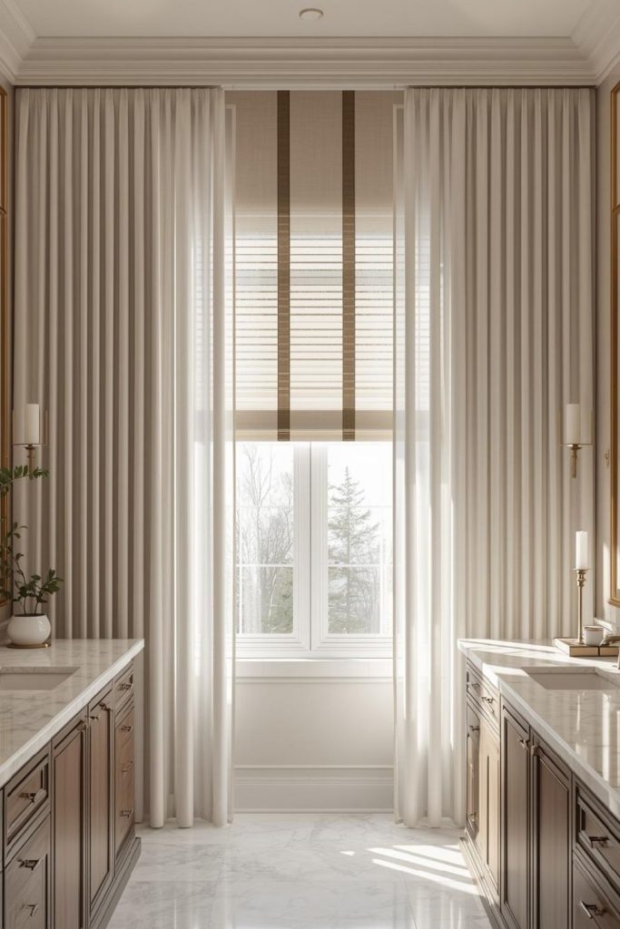 Gray Roller Shades Under Sheer Curtains to Balance Privacy and Daylight in Master Baths