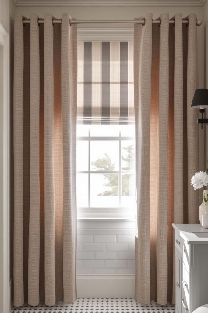 Bold striped bathroom window curtains paired with Roman shades create a striking visual impact. Stripes add dimension and energy to an otherwise neutral bathroom, while Roman shades provide practical light control and privacy. This combination works particularly well in modern bathrooms with minimal fixtures, adding personality without clutter. Choose fabrics that are easy to clean and resistant to humidity, like polyester blends. The shades can be raised or lowered to adjust sunlight, while the striped panels frame the window beautifully. Pairing color-coordinated stripes with neutral wall tones ensures balance, keeping the room from feeling chaotic. This setup offers a perfect blend of style and function, making the bathroom feel dynamic yet comfortable.