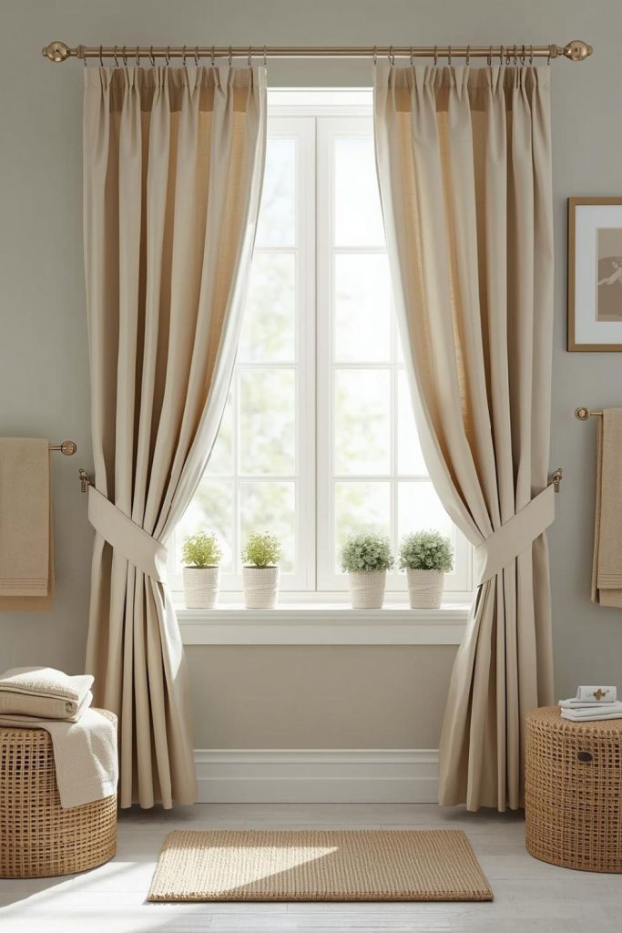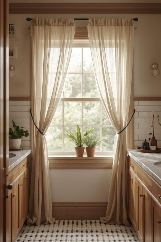 Farmhouse-Inspired Bathroom Window Curtains With Tied Drapes for a Relaxed Look