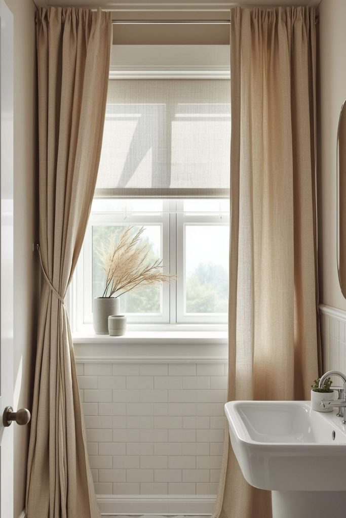 Half-length curtains with roller shades provide both style and functionality in small bathrooms. The half-length design preserves natural light while covering the lower window portion for privacy. Roller shades can be adjusted independently for complete darkness or filtered light. Choosing neutral or soft-toned fabrics prevents the space from feeling cramped. Installation with a tension rod ensures flexibility and protects walls. Layering lightweight panels over practical shades creates a modern, streamlined aesthetic. This setup is practical for urban apartments or compact master bathrooms while maintaining a polished, contemporary feel.