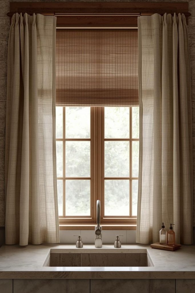 Rustic bathrooms gain warmth with wooden frame windows paired with soft curtain panels. Natural fibers like linen, cotton, or bamboo complement wood finishes, adding texture and character. Light-toned curtains brighten the space while still maintaining a cozy, earthy vibe. Soft folds create a relaxed, inviting feel, and panels can be tied back or draped for light adjustment. Neutral or warm shades harmonize with stone or tile elements, enhancing the rustic aesthetic. Installing curtains on tension rods or simple wooden rods preserves the homey feel. This styling approach balances privacy, practicality, and natural charm, turning a standard bathroom into a cozy retreat that invites relaxation.