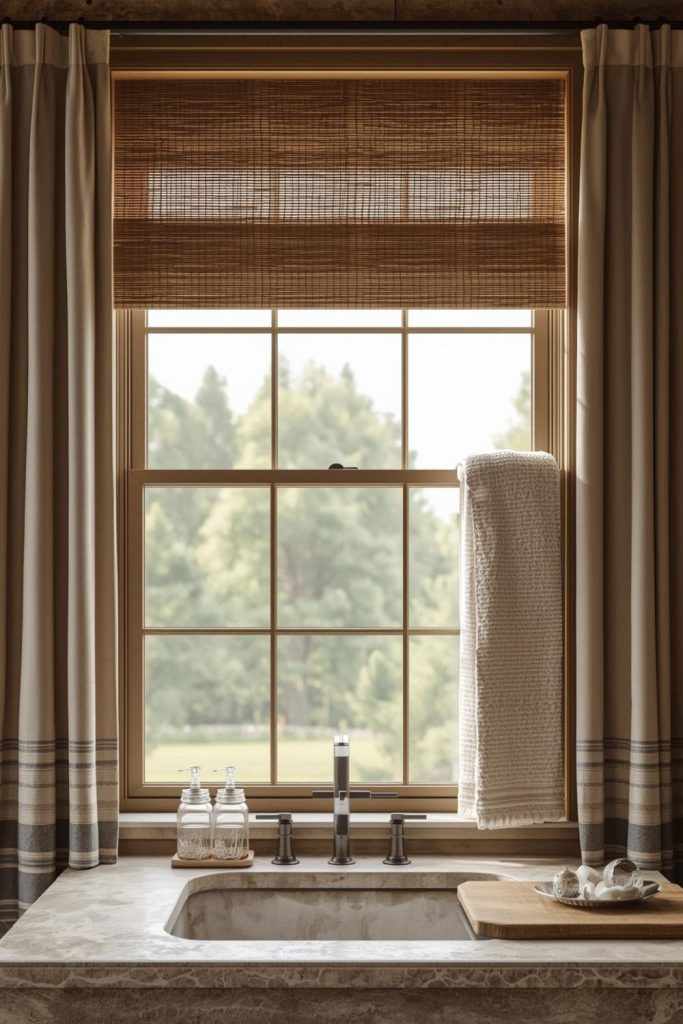 Rustic Farmhouse Bathroom Window Curtains Styled With Bamboo Shades for a Cozy Feel