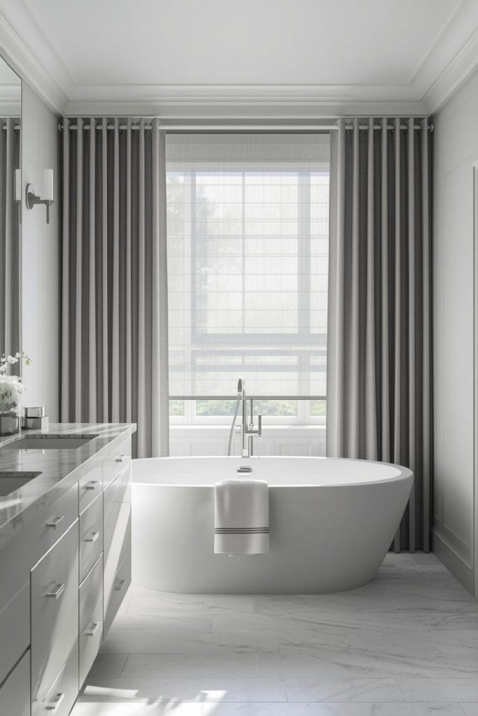 A master bathroom benefits from gray curtains paired with roller shades, creating a sleek and contemporary look. Gray provides a neutral backdrop that complements chrome fixtures, marble countertops, or minimalist tiles. Roller shades allow for complete privacy when needed, while curtain panels soften the room’s edges and add texture. For larger windows, floor-length curtains give height and elegance, while smaller windows work well with half-length panels. Combining the two provides flexibility in light control, ensuring the space can feel bright and energizing in the morning but cozy and private at night. This approach balances style and practicality for long-term satisfaction.