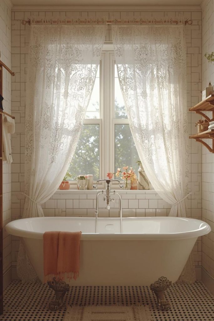 Vintage lace curtains bring charm and elegance to guest bathrooms. Lace panels filter light delicately, casting subtle patterns on walls and floors, enhancing the room’s ambiance. Soft natural light highlights the textures of tiles, vanities, and accessories, giving the space warmth and personality. Lace works beautifully with classic or retro-inspired décor, complementing clawfoot tubs, antique mirrors, or patterned wallpaper. For privacy, layering lace with a translucent roller shade ensures guests feel comfortable while still enjoying the sunlit atmosphere. These curtains are perfect for creating a welcoming, romantic feel in a space often overlooked but crucial to a home’s overall impression.