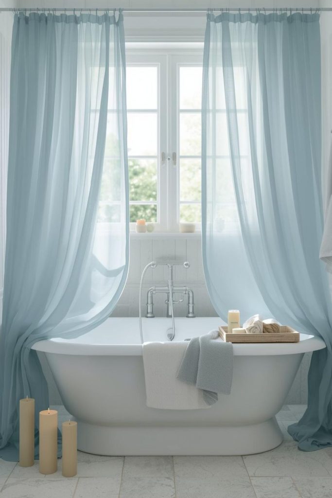 Soft blue sheer drapes over a bathtub create a calming, spa-like environment. The color evokes serenity and pairs well with white fixtures, natural stone, or wood accents. Sheers allow filtered light to enter while offering gentle privacy during baths. Lightweight fabrics float gracefully, creating motion and texture without making the space feel heavy. Tiebacks or small hooks can adjust the curtains to let more light in during the day. Blue sheers are particularly effective in bathrooms with water features, enhancing the relaxing atmosphere and visually connecting the design with the soothing essence of water. This setup turns an ordinary bathroom into a mini-retreat.