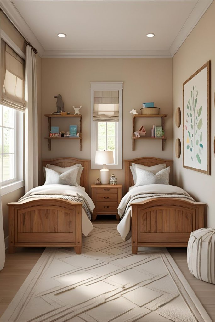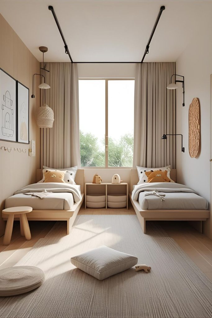 Neutral Tones and Wood Finishes for a Calming Small Bedroom for Two Kids