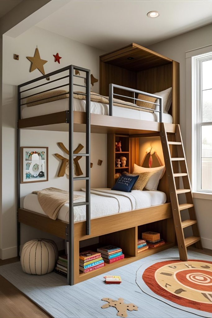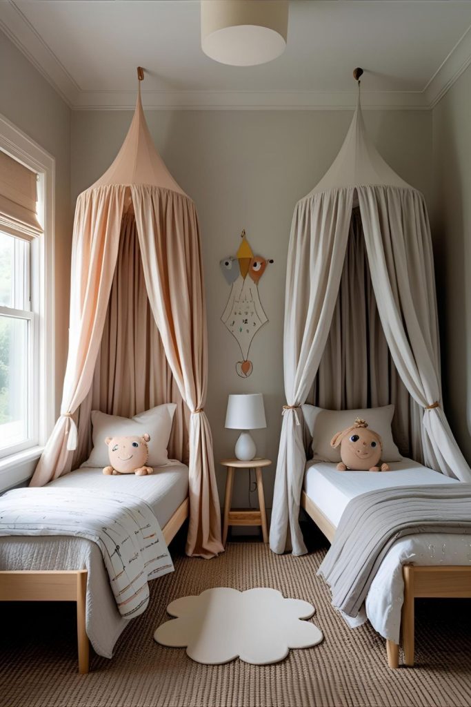 Sometimes kids just need a little privacy. Hang a curtain from the ceiling or drape a canopy over each bed. It gives each kid a mini “room” inside the room. It’s not soundproof, but it makes a big difference emotionally. Feels like personal space, even if they’re only a foot apart.