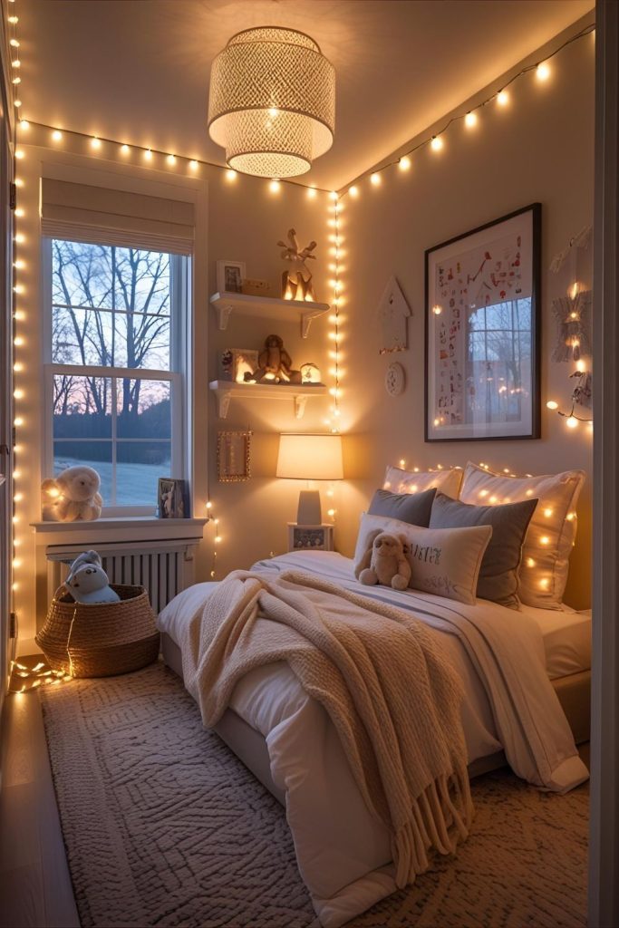 Skip the overhead light when you can. Soft lamps, fairy lights, and string bulbs make the room feel cozy and warm. We strung a reading light around the top bunk and added a clip-on for the bottom. The glow helps them wind down—and keeps night terrors at bay.