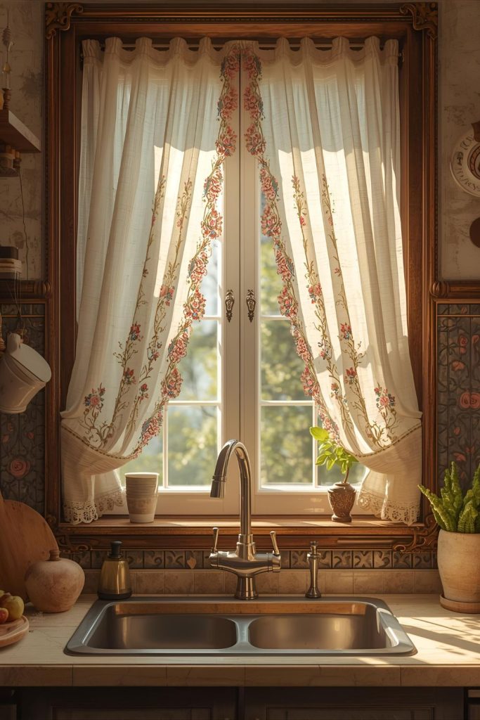 Embroidered café panels create texture and interest above a sink while maintaining functional coverage. The embroidery adds craftsmanship and charm without overwhelming the window. Lightweight fabrics ensure that panels are easy to wash and adjust, making them practical for everyday kitchen use. These kitchen curtains above sink highlight the window as a decorative element, perfect for homeowners who enjoy artisanal touches and subtle detailing in their interior décor.