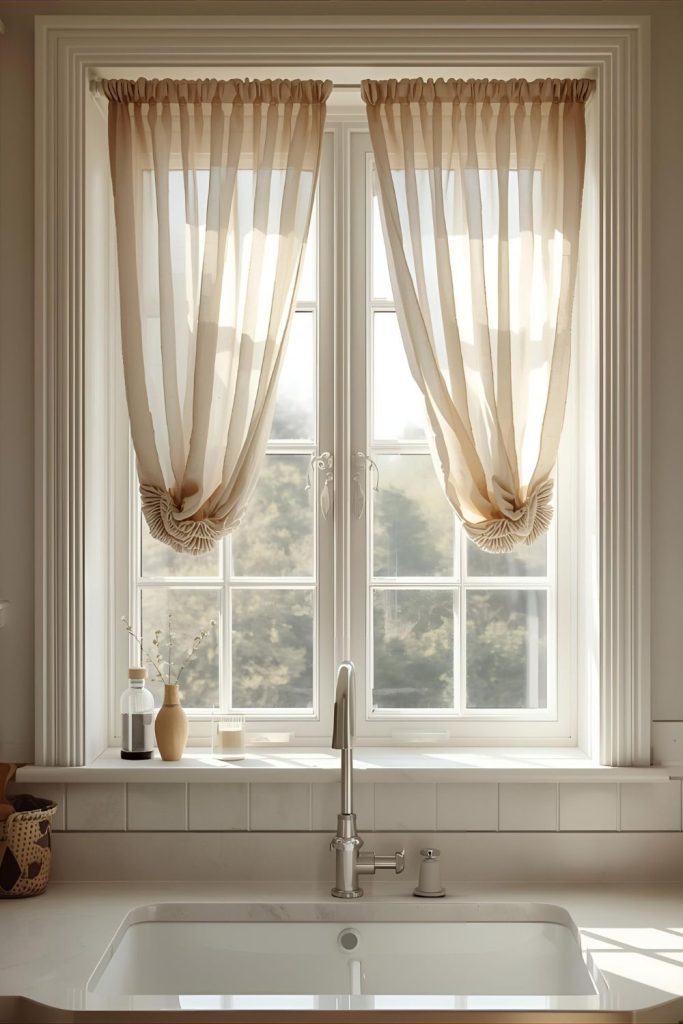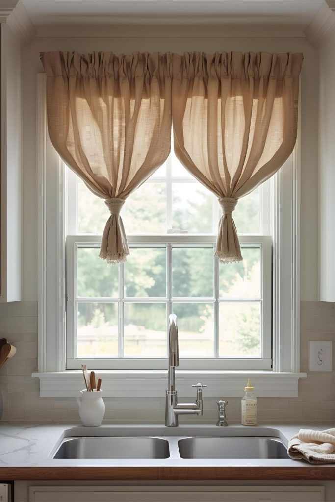 Sheer linen café curtains bring a light, breezy feeling to your kitchen. They softly filter sunlight while maintaining an open, airy look over your sink, perfect for smaller kitchens or spaces where natural light is a priority. Linen drapes naturally wrinkle and flow, adding casual elegance without feeling stiff. These curtains are easy to tie back or let hang, offering flexible light control. For a clean, bright kitchen, sheer linen kitchen curtains above sink create a subtle, timeless charm that complements wood, stone, or painted surfaces.
