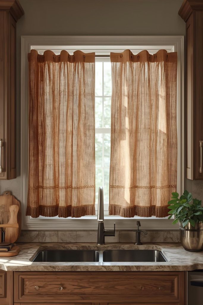 Textured woven curtains add depth and tactile interest to a kitchen window. Materials like jute, cotton blends, or linen give a natural, earthy feel that complements wood cabinetry and stone countertops. The texture catches light in subtle ways, creating warmth and character without overwhelming the space. These kitchen curtains above sink are durable enough for daily use and can be tied back or layered with sheers for adjustable light control. Perfect for homeowners seeking a cozy, grounded look.