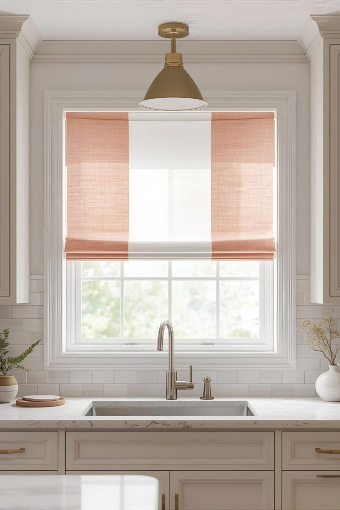 Monochromatic textured shades maintain a streamlined, modern aesthetic while introducing subtle depth to the window. Neutral shades like gray, beige, or cream harmonize with cabinets and counters, making the sink area feel cohesive. Textured fabrics prevent the design from appearing flat while remaining easy to wash or adjust. These kitchen curtains above sink are perfect for minimalist homeowners who want clean lines, understated elegance, and functional light control.