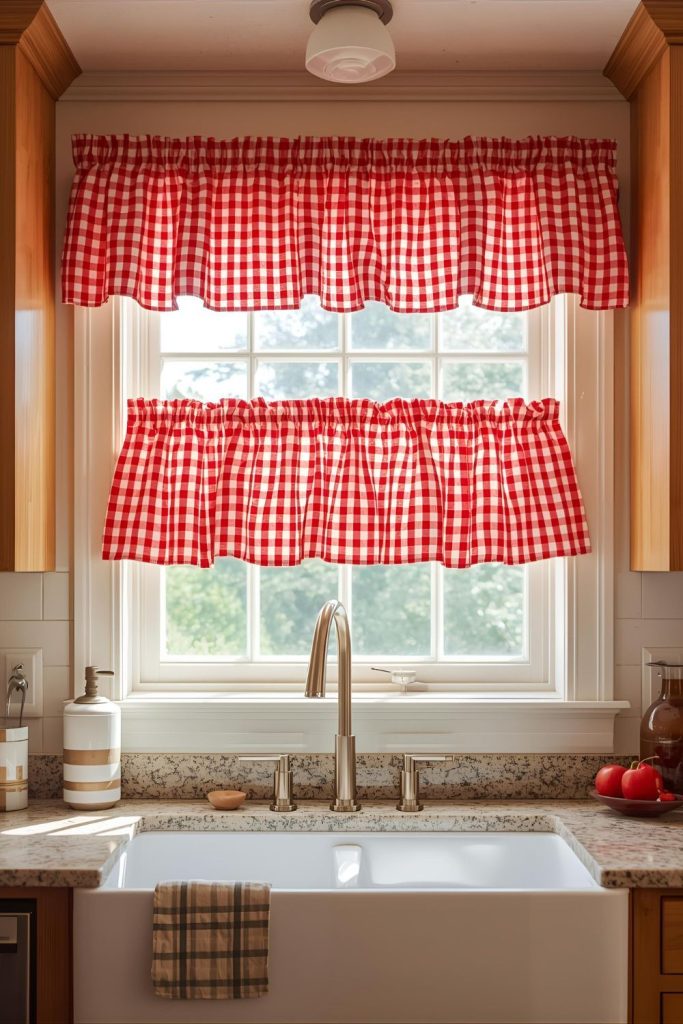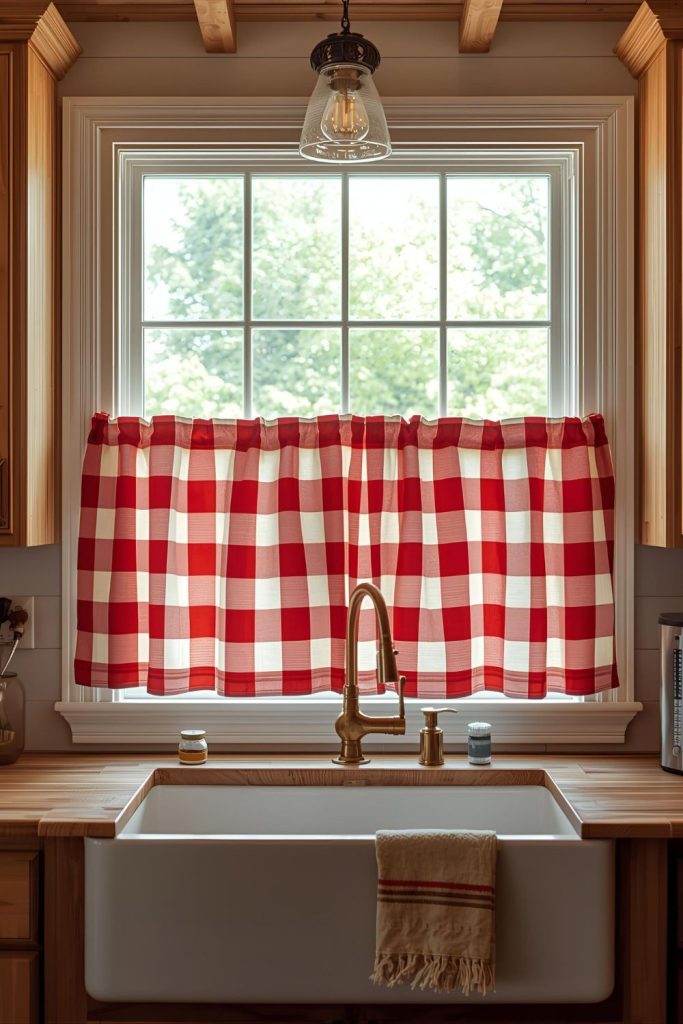 Adding buffalo-check farmhouse curtains above the sink for a cozy, rustic charm