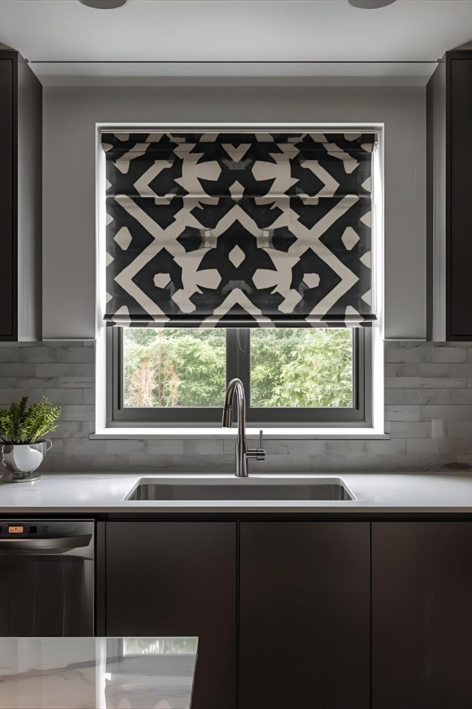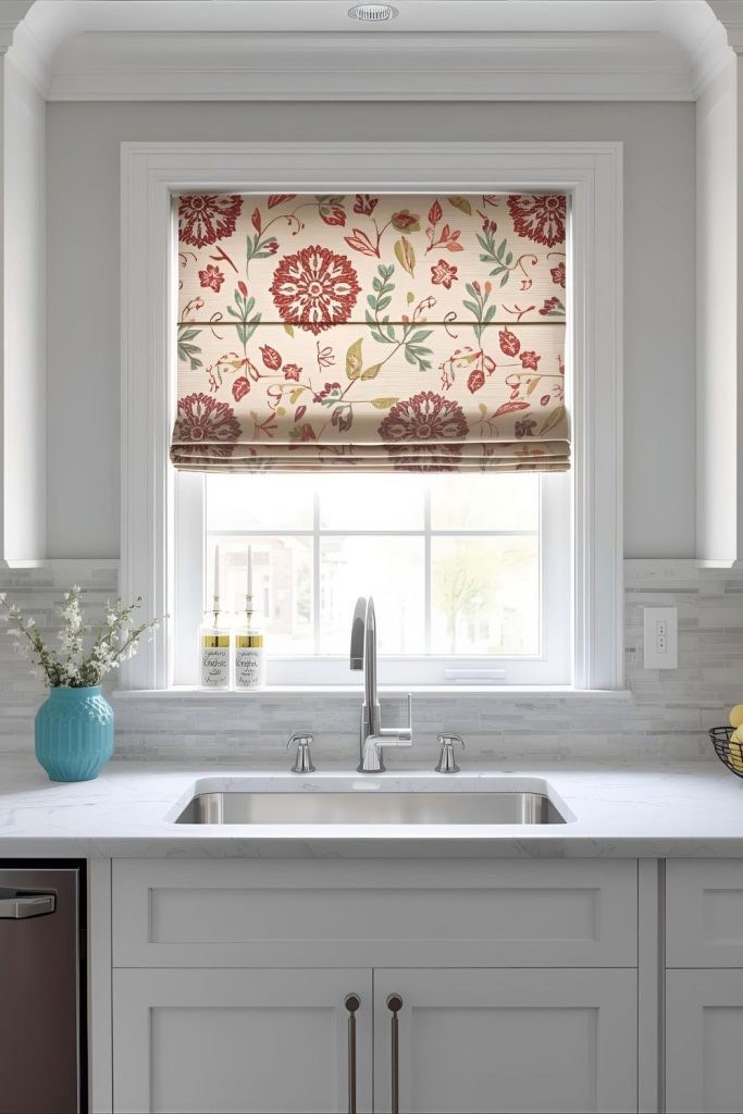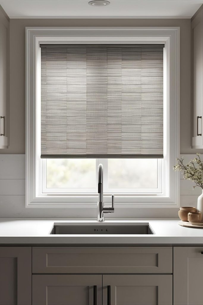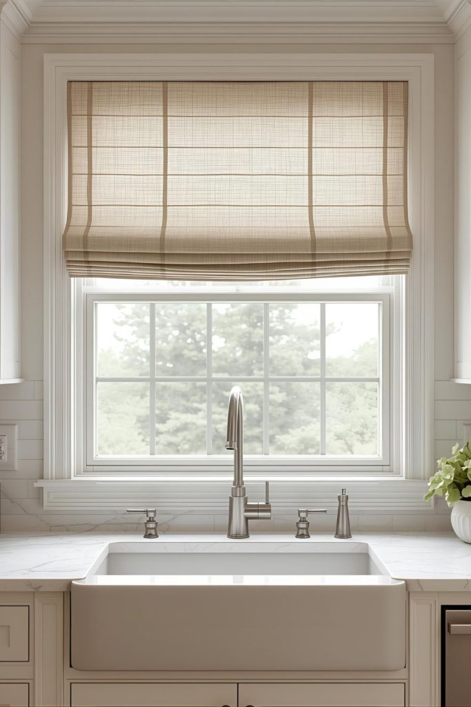 Bamboo Roman shades bring warmth and texture to kitchen windows, complementing natural wood tones, stone countertops, and greenery. These shades provide privacy while allowing adjustable light filtering, ideal for sinks that receive bright sunlight. Bamboo is easy to maintain and resistant to moisture, making it practical for high-use kitchens. When installed as kitchen curtains above sink, Roman shades create a clean, contemporary look with organic appeal, blending function and style seamlessly.