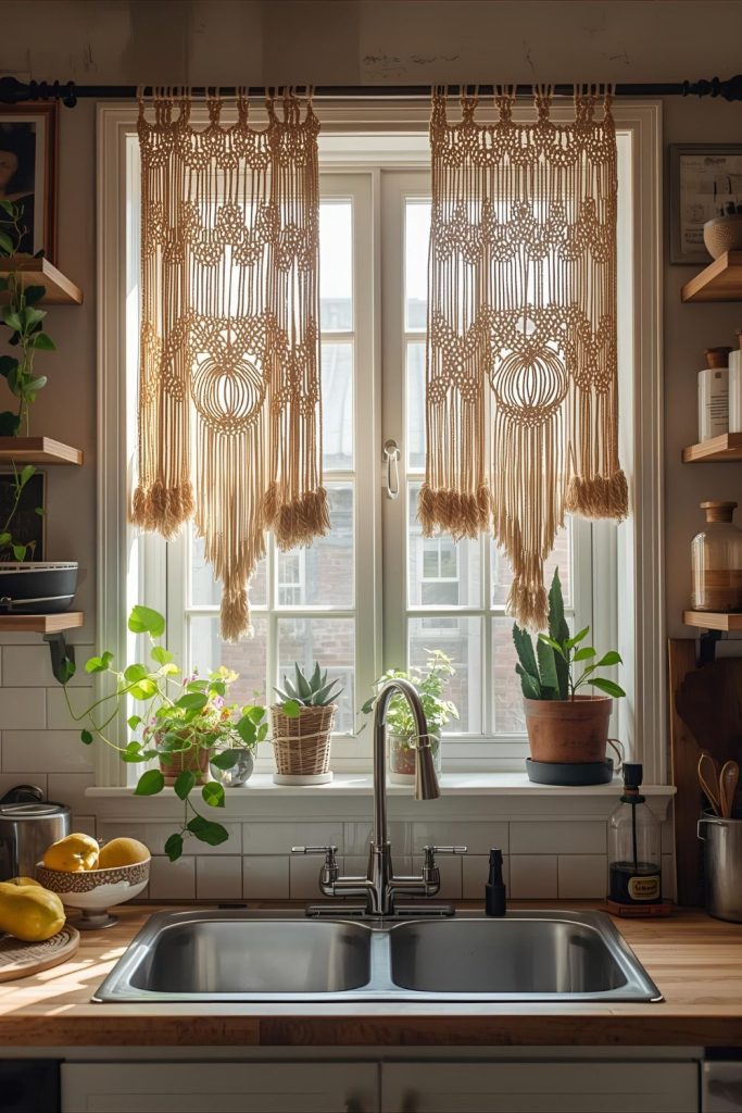 Macramé curtains add artisanal texture and a relaxed, bohemian vibe to kitchen windows. Hand-knotted designs allow light to filter through while offering subtle privacy. Cotton cords or blends are practical for everyday use and easy to adjust or hang. These kitchen curtains above sink transform the sink area into a visually interesting focal point while bringing a natural, handcrafted aesthetic that works well in casual, eclectic kitchens.