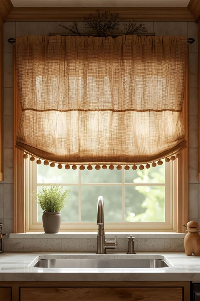 Curtains with wooden bead trim bring playful yet earthy detail to a kitchen window. The trim adds visual interest while complementing wooden cabinetry, shelves, or countertops. Cotton or linen blends are durable and easy to maintain, making them ideal for a sink area. As kitchen curtains above sink, these trims draw subtle attention to the window while tying in natural textures throughout the kitchen, balancing functionality with design appeal.