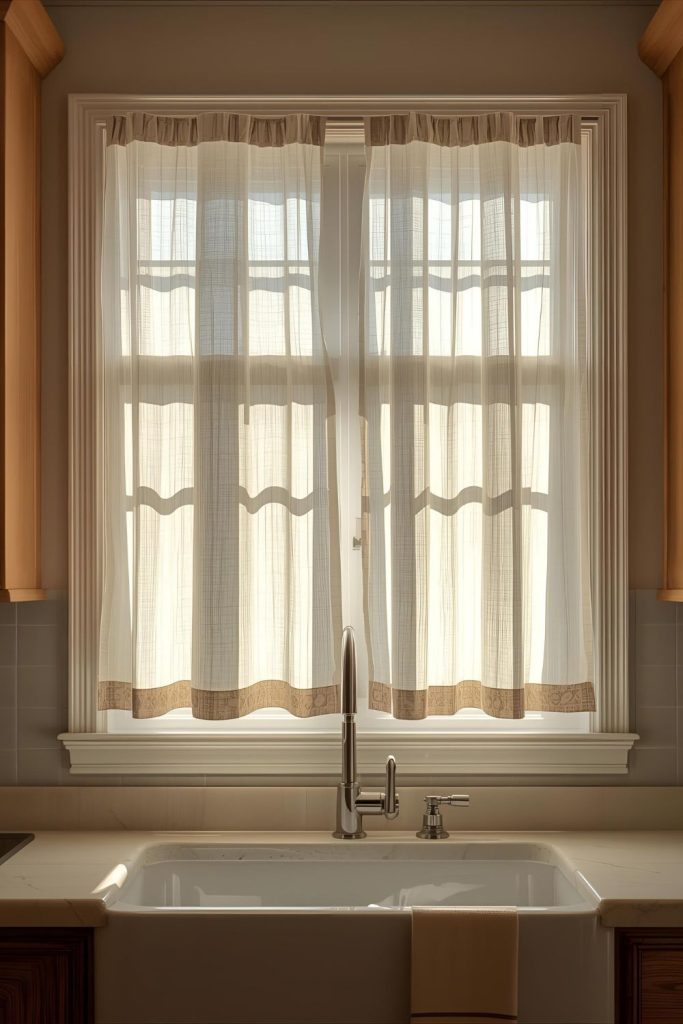 Using sheer linen café curtains above the sink to create an airy, sunlit look