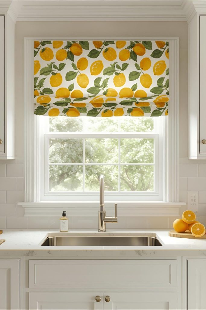 Citrus-patterned curtains instantly add energy and color to a neutral kitchen. The bright yellows, oranges, and greens create a lively focal point above the sink while complementing white or muted cabinetry. Cotton or cotton blends ensure durability and frequent washing without losing vibrancy. As kitchen curtains above sink, citrus designs infuse freshness and personality, turning a simple window into a cheerful, inviting element of the kitchen.