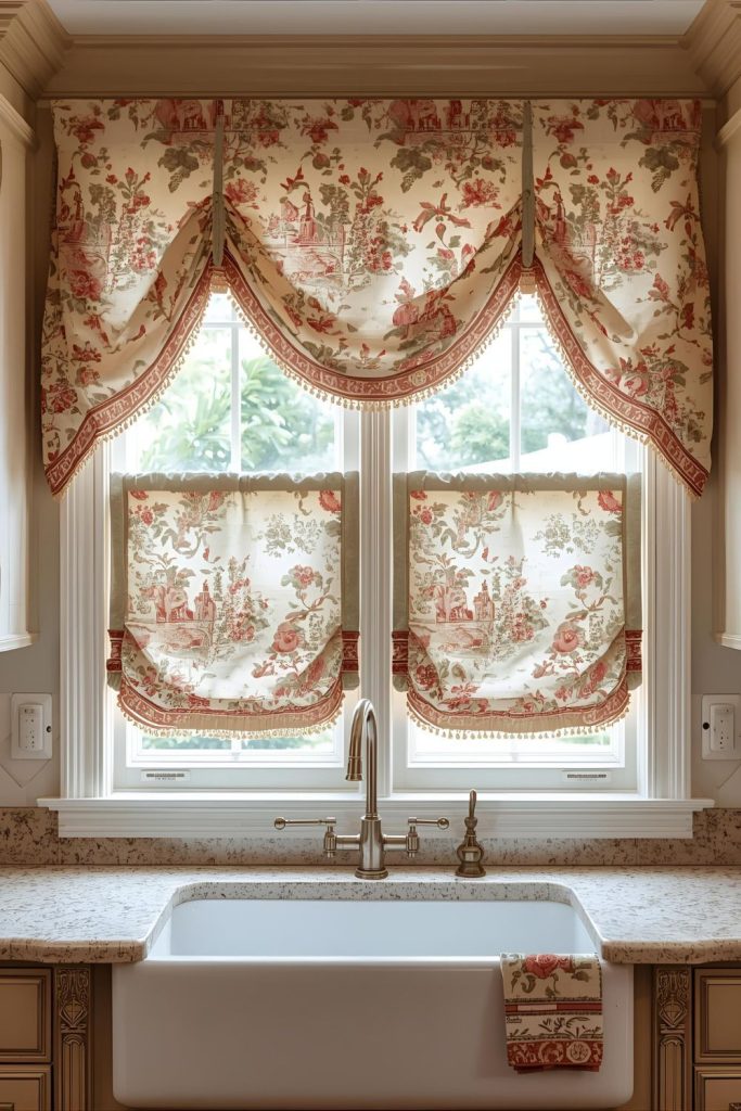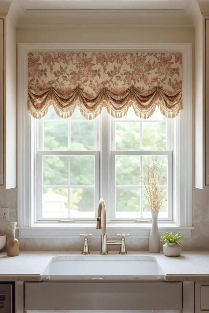 Layered curtains with a mini valance offer dimension and sophistication to the sink area. Combining a short valance with café curtains or shades allows homeowners to control light while creating a polished look. Lightweight, durable fabrics such as cotton or linen work best. These kitchen curtains above sink make the window feel thoughtfully styled, adding depth, texture, and visual appeal without reducing functionality or cluttering the space.