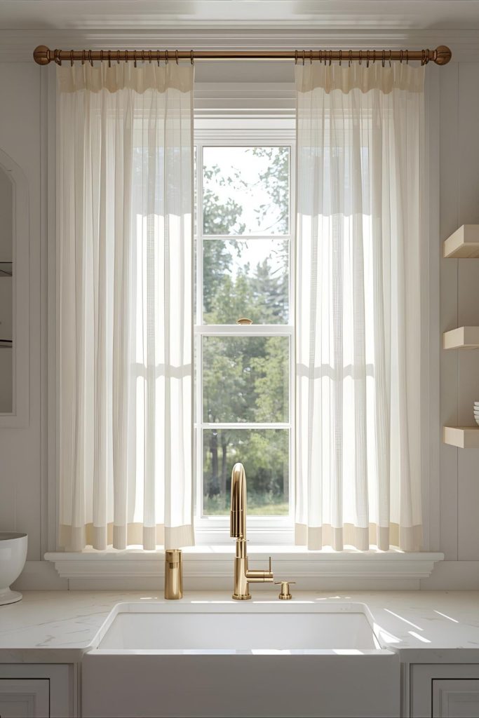 Sheer white café curtains paired with brass rods create a bright, clean, and timeless look. The sheerness allows light to filter through, keeping the kitchen airy while providing modest privacy. Brass rods add subtle warmth and elegance to the window frame. As kitchen curtains above sink, this combination works well with white, gray, or pastel kitchens, offering a classic finish that is easy to maintain, adjust, and style.