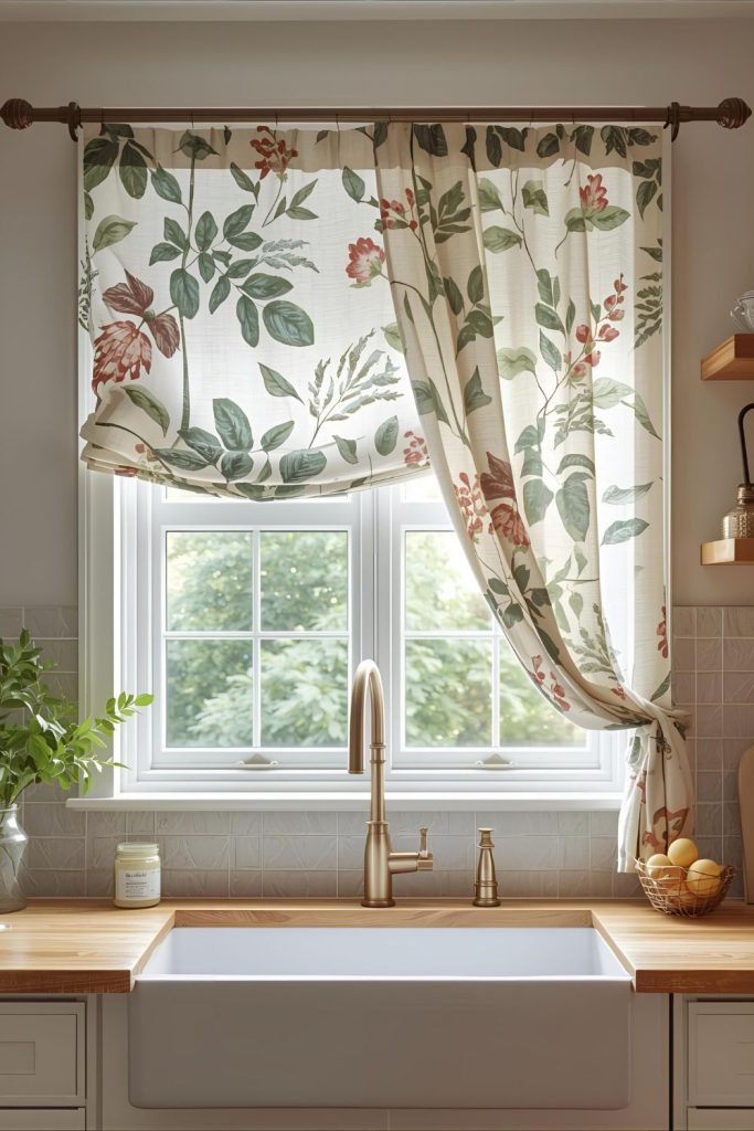 Choosing botanical print curtains to bring a fresh garden feel to the sink space