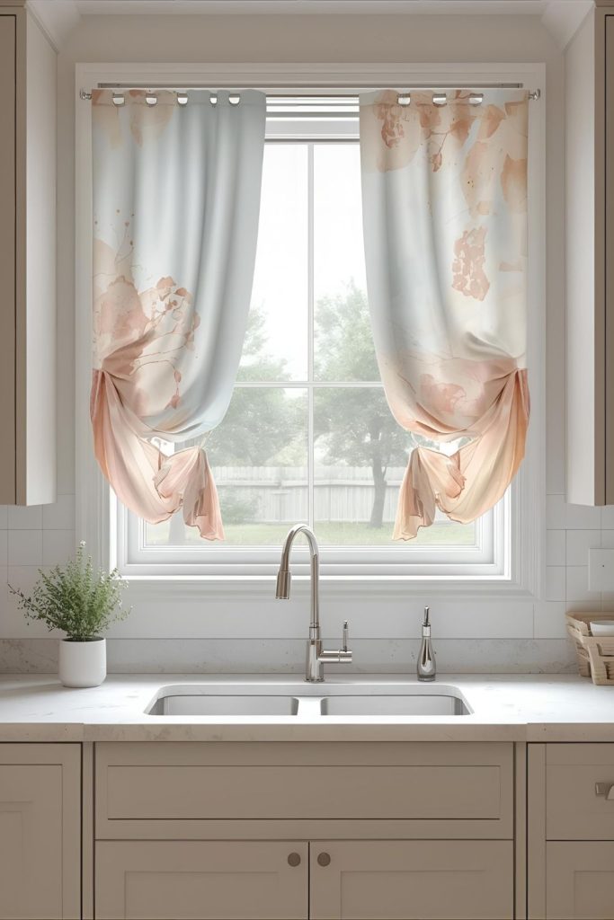 Soft pastel watercolor curtains introduce subtle, dreamy color that brightens and calms the kitchen. Gentle washes of pink, blue, or green create an artistic yet understated look. Cotton or cotton blends are easy to care for, durable, and practical for sink areas. These kitchen curtains above sink turn the window into a peaceful focal point, enhancing the kitchen’s overall aesthetic while maintaining light control and everyday functionality.
