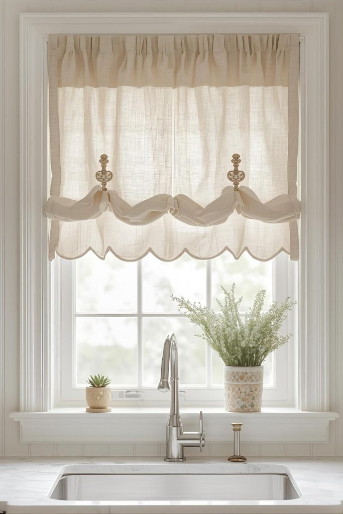 Installing scalloped-edge cotton curtains to give the sink area a soft, decorative finish
