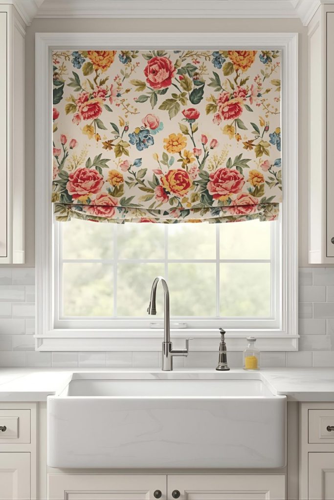 Floral drapes can turn a neutral kitchen into a lively, cheerful space. Light, medium, or bright floral prints over the sink introduce a pop of color, helping the window area stand out without clashing with cabinets or countertops. Medium-weight cotton or linen fabrics are perfect for daily use, providing durability while remaining easy to tie back or adjust. These kitchen curtains above sink work well in traditional, cottage, or farmhouse kitchens, allowing homeowners to express personality while keeping the area functional and visually appealing.