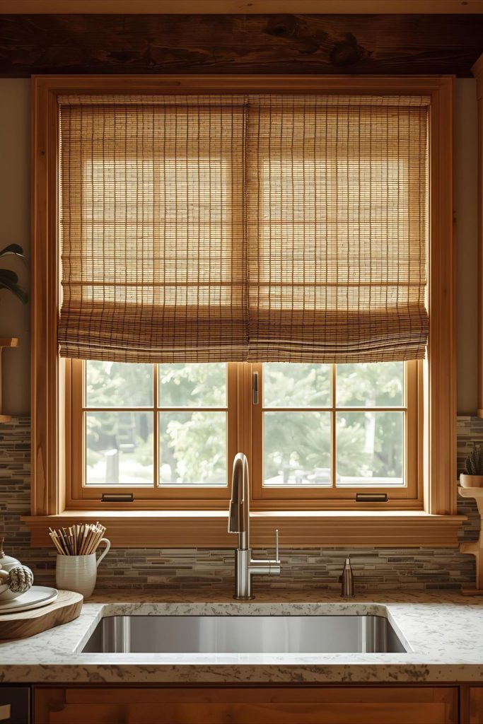 Incorporating bamboo Roman shades above the sink for a natural, organic touch