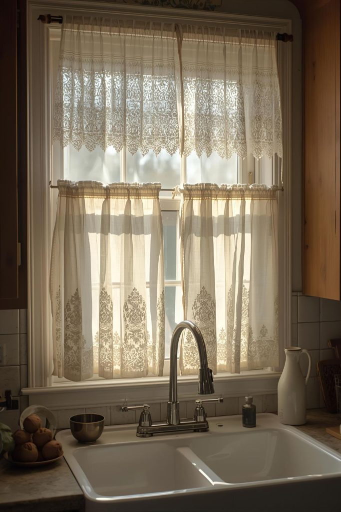 Eyelet lace curtains add a vintage, airy feel to a kitchen window. The open weave allows natural light while still offering privacy and softening the view outside. Lightweight fabrics like cotton or lace blends are easy to wash and maintain. Hanging them with simple rods over the sink creates a charming focal point, giving the kitchen a touch of classic elegance. These kitchen curtains above sink are ideal for homeowners seeking a traditional or cottage aesthetic without sacrificing practicality.