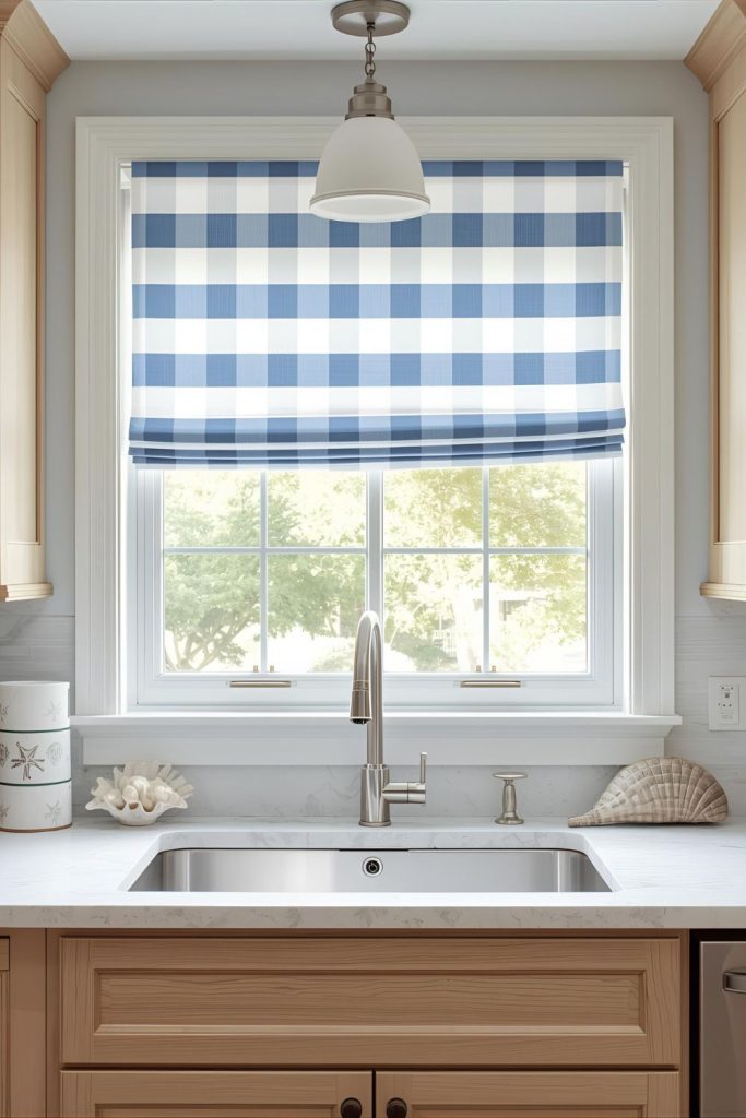 Nautical stripes bring seaside charm to kitchens, pairing beautifully with white cabinets, blue accents, and light wood tones. Cotton or polyester blends ensure durability and easy maintenance in a busy kitchen. Striped kitchen curtains above sink guide the eye horizontally, making the space feel wider and more open. Tiebacks or simple loops allow flexible light control while keeping the nautical theme crisp and clean. These curtains are perfect for homeowners wanting a coastal-inspired, stylish sink area.
