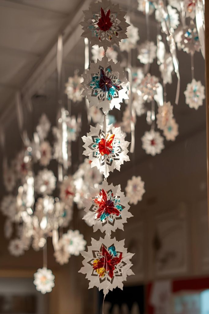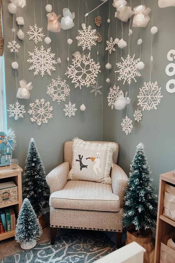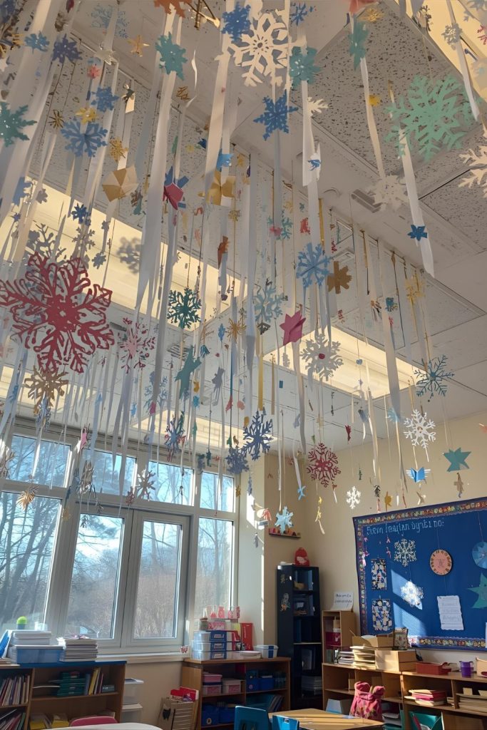 Paper snowflakes and icicles can be hung from the ceiling to create a layered winter effect. Students can help cut out shapes, add glitter, or draw patterns. This adds visual interest overhead, softens the lighting, and encourages students to look around and notice details. The hanging decorations can also be tied into lessons on symmetry and geometry.