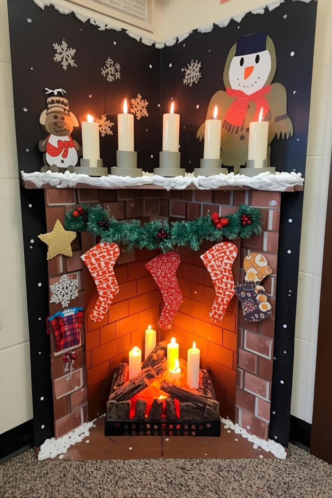 Create a cozy corner using paper or cardboard to simulate a fireplace. Battery candles can safely add a warm glow. Students can read, share stories, or engage in calm activities in this winter-themed area.