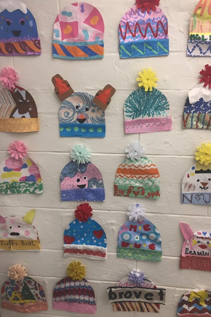 Students decorate paper hats to display on a wall or board. This simple decoration allows individuality and promotes seasonal creativity. It also serves as a cheerful visual across the classroom.