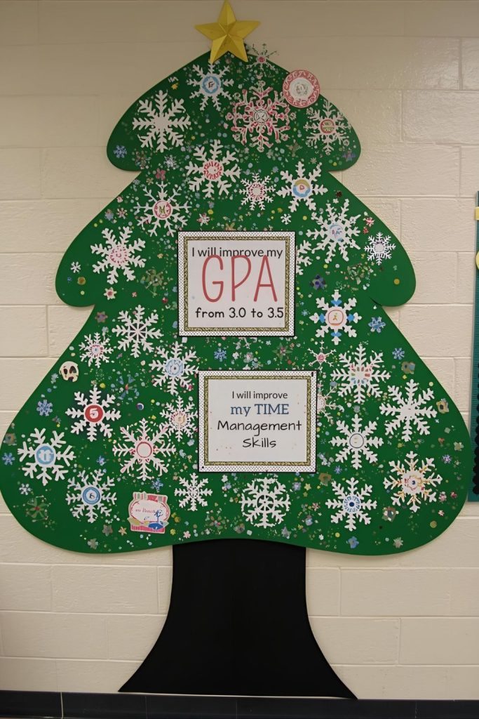 A tree-shaped display where each snowflake lists a student goal. Students add or update snowflakes, combining visual appeal with personal reflection and motivation.