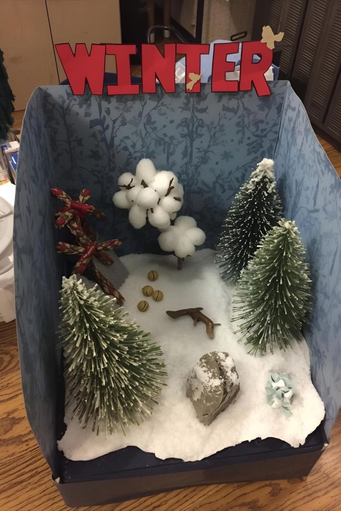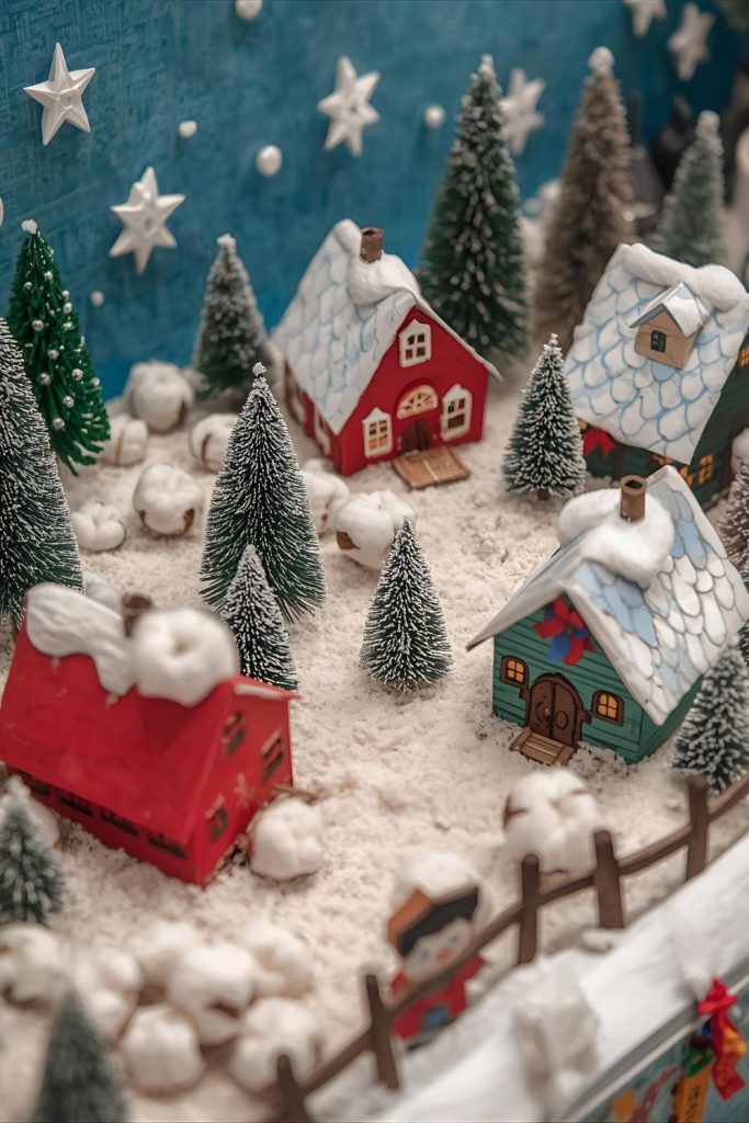 Students create a small winter village with paper, cotton, and figurines. The diorama promotes creativity, teamwork, and storytelling while brightening classroom corners.