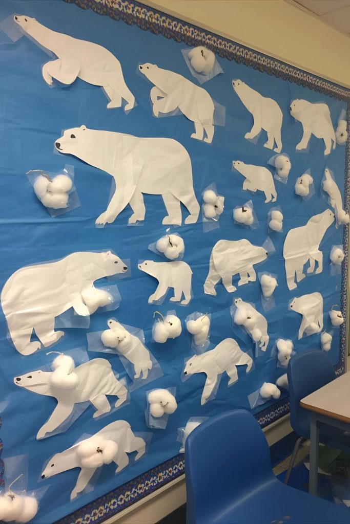 A polar bear display made with cotton for ice and student-researched facts encourages learning about arctic animals. Students interact with and add content, merging decor with education.
