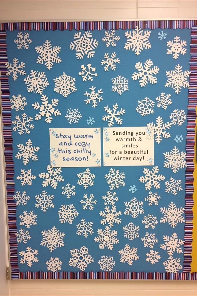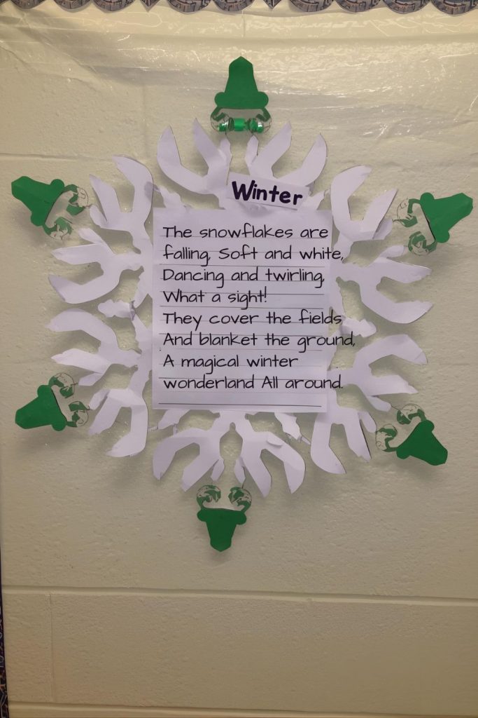 Snowflakes feature short poems written by students. This display encourages literacy, creativity, and seasonal cheer while providing an interactive, visually appealing element.