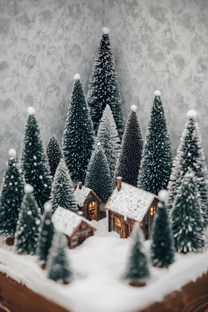 Miniature trees and snow-covered paper structures arranged like a forest, forming a cozy winter-themed corner or shelf display.