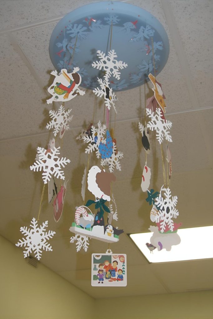 Mobiles with winter scenes or snowflakes hang from the ceiling, adding movement and visual interest. Students can help craft each piece, connecting art with classroom decoration.