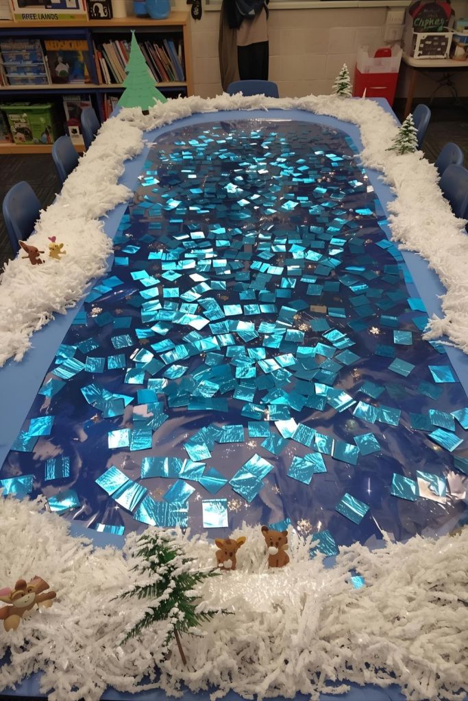 A section of the classroom floor or table transformed to look like a frozen lake using reflective materials, surrounded by paper snowbanks, miniature winter trees, and small winter animal figures, creating a sparkling winter scene.