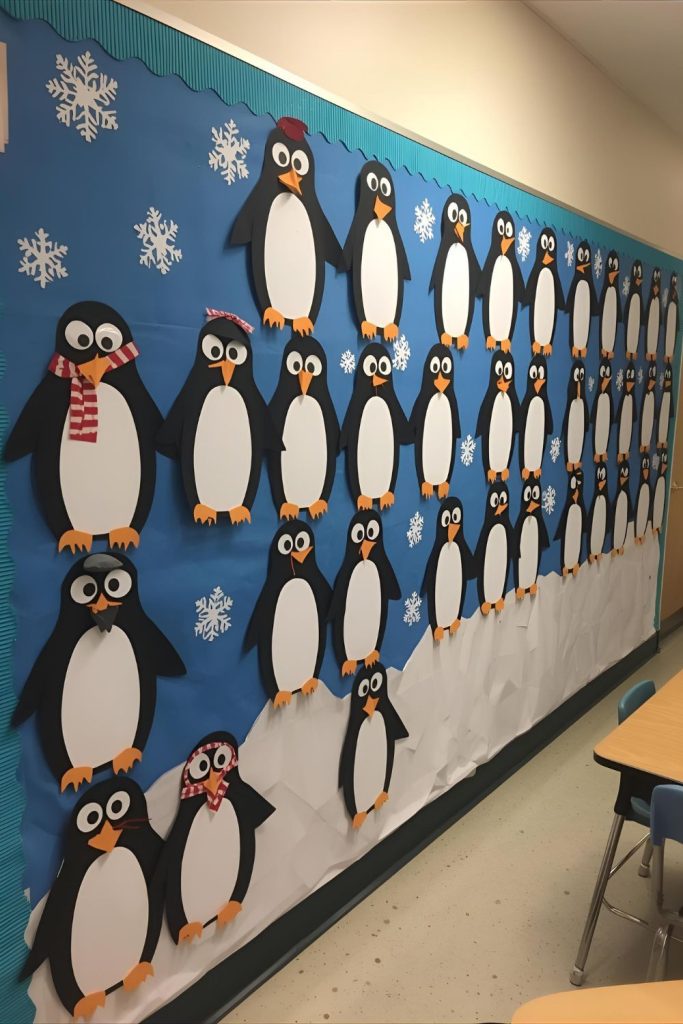 A wall filled with paper penguins, each labeled with student names or facts, creates a playful thematic display. Students can decorate penguins individually, enhancing ownership. The display can also serve as a springboard for lessons on habitats, adaptation, or winter animals.