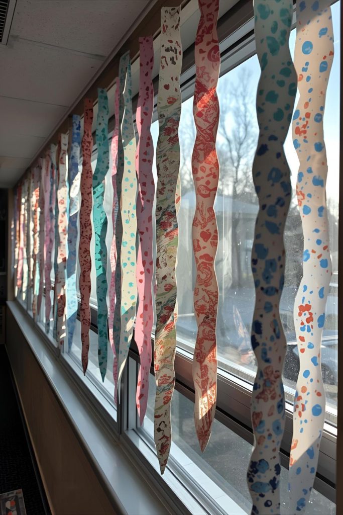 Paper icicle chains hung along windows bring winter indoors. Students can design and color each link. It’s simple, low-cost, and adds festive decoration while improving fine motor skills and coordination during the creation process.