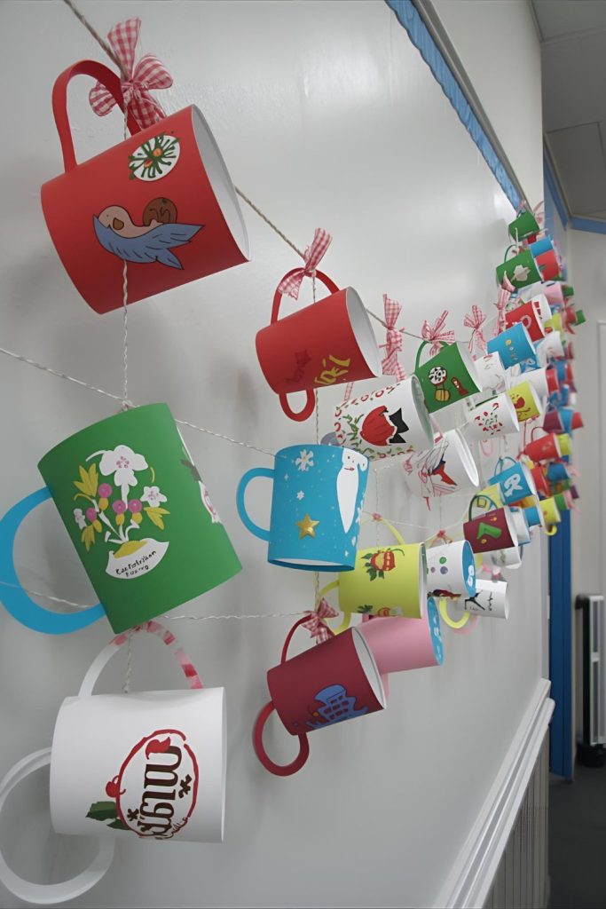 Using cutouts of paper mugs with winter designs, you can string a garland across the classroom. Students decorate mugs with patterns, names, or seasonal messages. This interactive decoration is functional for aesthetic purposes and encourages expression.