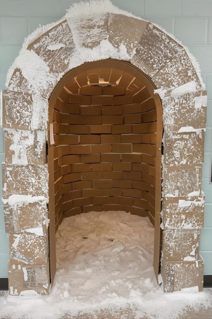 Create an igloo-style tunnel at the classroom entrance using stacked cardboard blocks. Students can paint bricks white or add snow textures. This sets a playful winter tone from the moment they enter and inspires imaginative play.