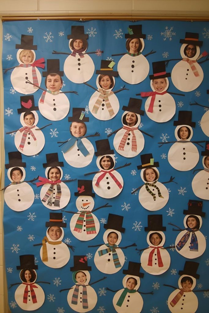 Students create snowmen with their faces or characteristics integrated. This activity promotes creativity, personal expression, and humor. A wall of snowmen shows diversity while adding a cheerful visual element to the classroom.